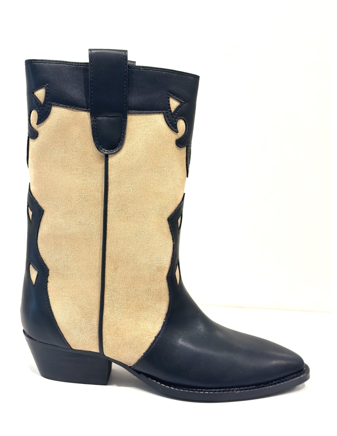 Botín de ante de caña ancha con tacón bajo, en color camel y negro.