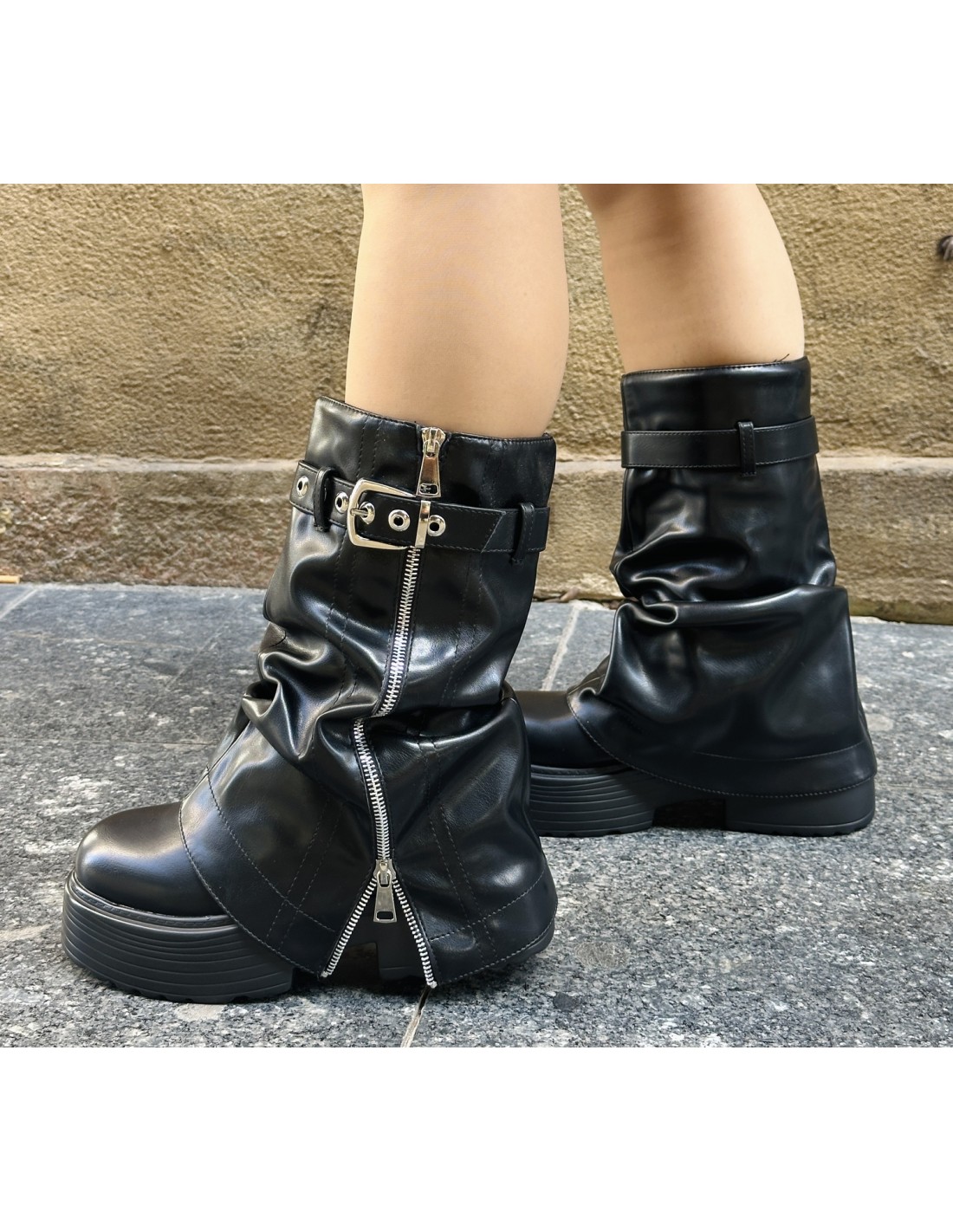 Atrévete a destacar con estas botas de diseño moderno, confeccionadas en acabado tipo cuero negro con un look audaz y versátil. Su caña media con efecto arrugado y cierre de cremallera frontal aporta un toque rebelde, mientras que la hebilla metálica ajustable resalta su carácter único.
