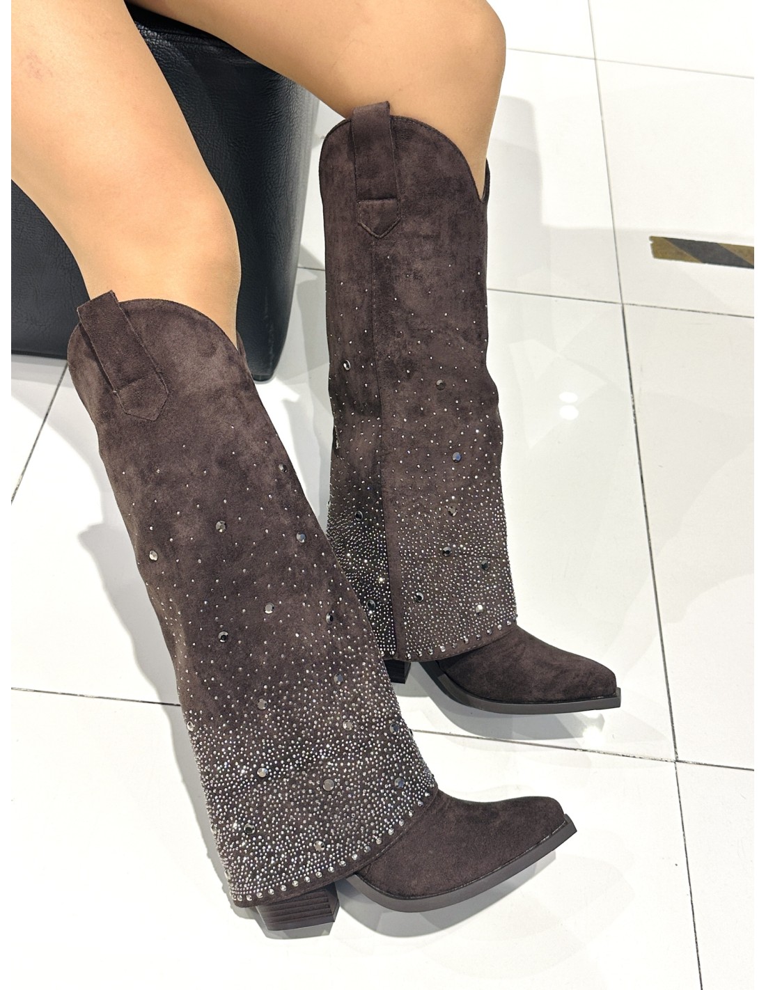 Estas botas marrón .negro y  beige son el equilibrio perfecto entre estilo y sofisticación. Fabricadas en un suave material tipo gamuza, destacan por su diseño moderno con aplicaciones brillantes que aportan un toque de elegancia y glamour a cualquier look. Su caña alta y punta ligeramente redondeada estilizan la figura, mientras que el tacón bajo y ancho brinda comodidad y estabilidad durante todo el día.