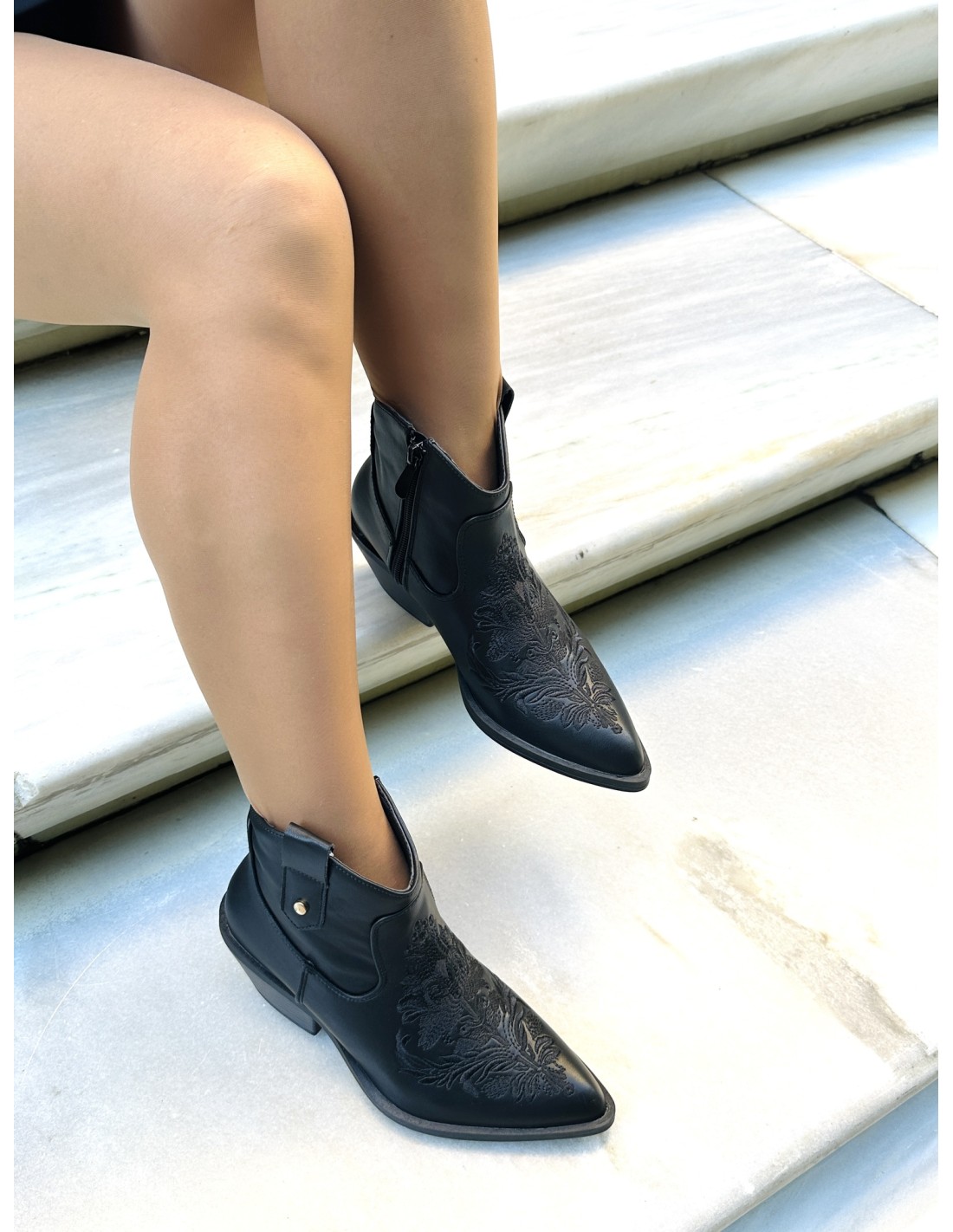 Estos botines negros son el equilibrio perfecto entre elegancia y estilo moderno. Con un diseño en punta y delicados bordados en la parte frontal, añaden un toque sofisticado a cualquier look. Están confeccionados en material de alta calidad con acabado suave y cuentan con un cierre lateral que facilita su colocación. El pequeño tacón brinda comodidad y una silueta estilizada, ideal para usar tanto de día como de noche. Perfectos para combinar con vestidos, faldas o jeans, estos botines se convertirán en tu aliado favorito para destacar con personalidad y buen gusto.