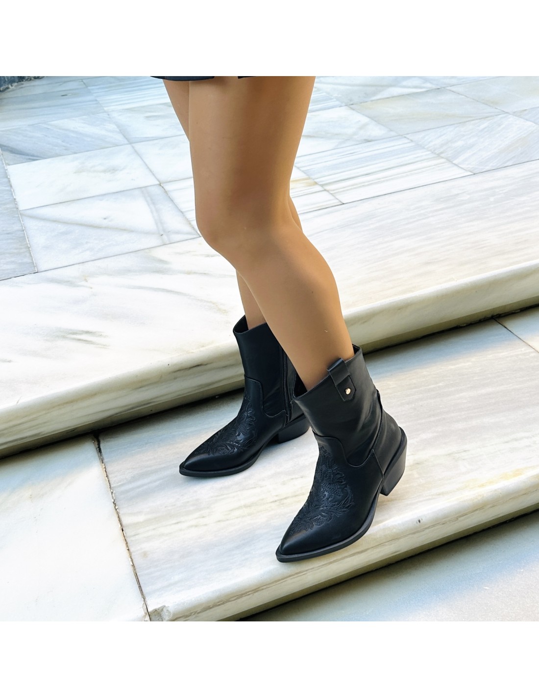 Estos botines negros son el equilibrio perfecto entre elegancia y estilo moderno. Con un diseño en punta y delicados bordados en la parte frontal, añaden un toque sofisticado a cualquier look. Están confeccionados en material de alta calidad con acabado suave y cuentan con un cierre lateral que facilita su colocación. El pequeño tacón brinda comodidad y una silueta estilizada, ideal para usar tanto de día como de noche. Perfectos para combinar con vestidos, faldas o jeans, estos botines se convertirán en tu aliado favorito para destacar con personalidad y buen gusto.