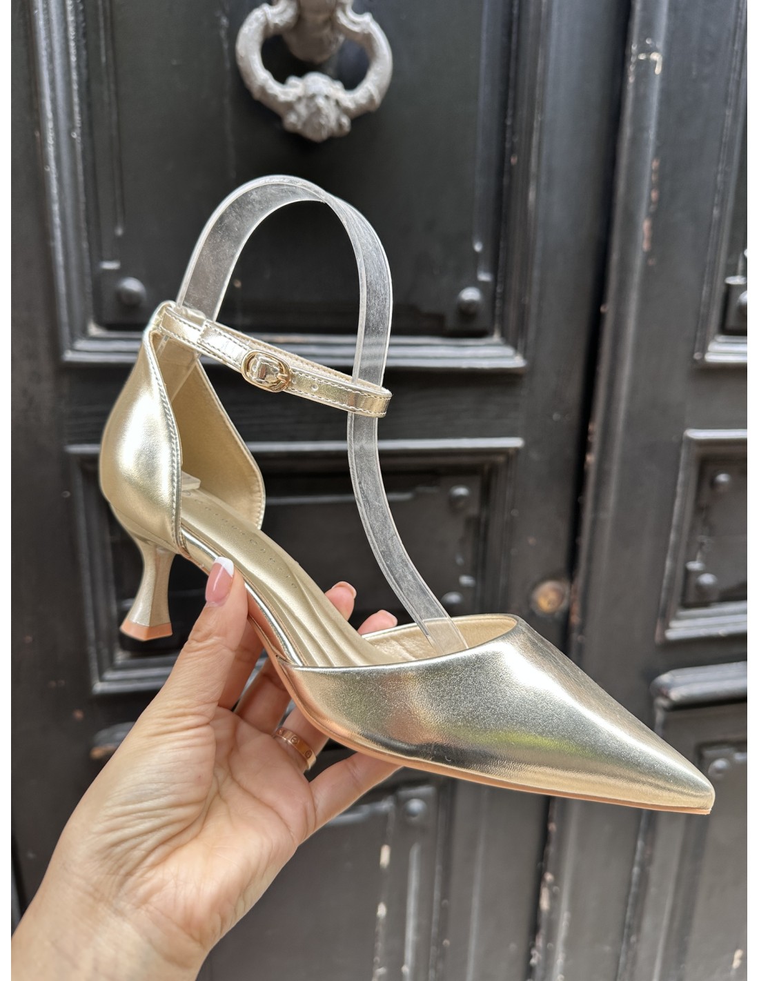 Destaca con estilo con este sofisticado zapato de tacón en acabado dorado metalizado, perfecto para quienes buscan un toque de glamour sin perder la elegancia. Su punta fina estiliza la silueta del pie, mientras que el tacón medio tipo kitten brinda altura y comodidad para usarlo durante horas.