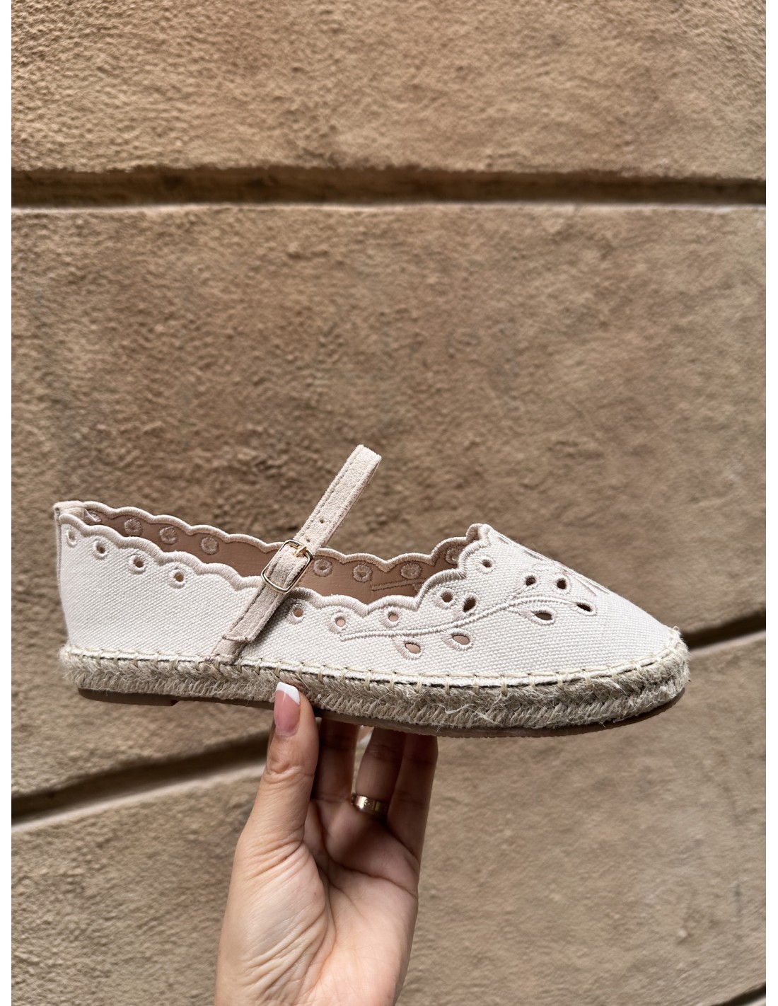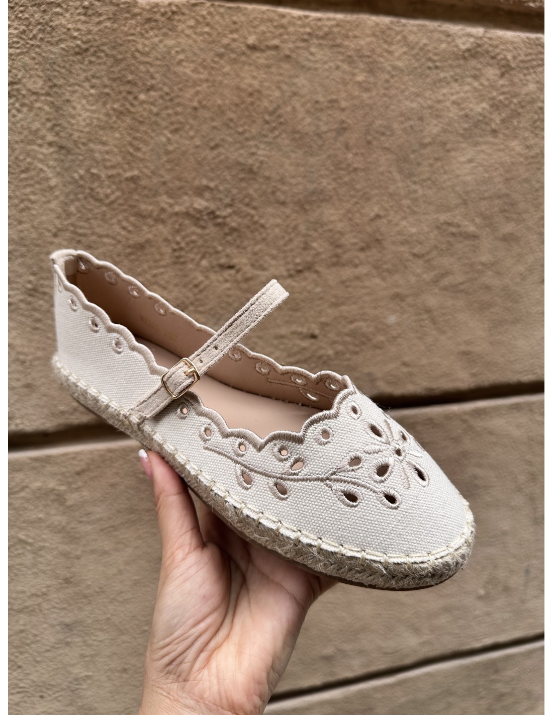 Este encantador calzado tipo espadrille combina comodidad y estilo en un diseño perfecto para el día a día. Confeccionado en tela color crema, destaca por sus delicados bordados en tono café que aportan un toque artesanal y elegante.