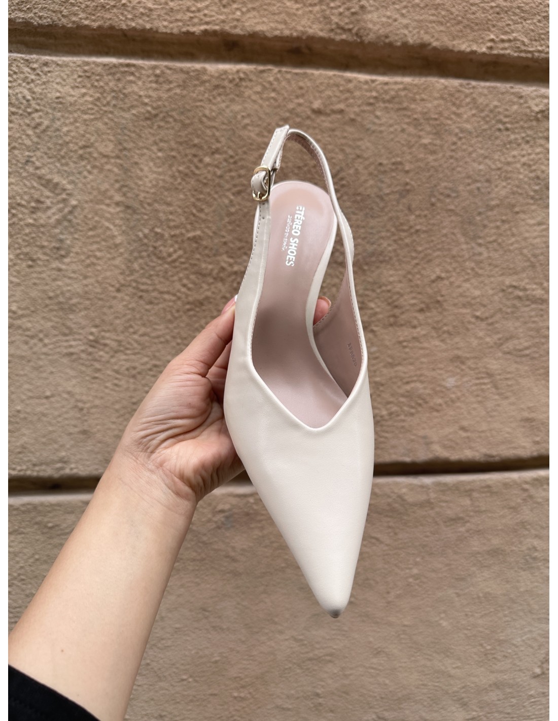 Cuenta con correa trasera ajustable con hebilla, que brinda un ajuste seguro y delicado al tobillo. Su acabado minimalista y su color neutro lo convierten en una opción ideal para combinar con outfits formales, de oficina o incluso looks casuales más refinados.